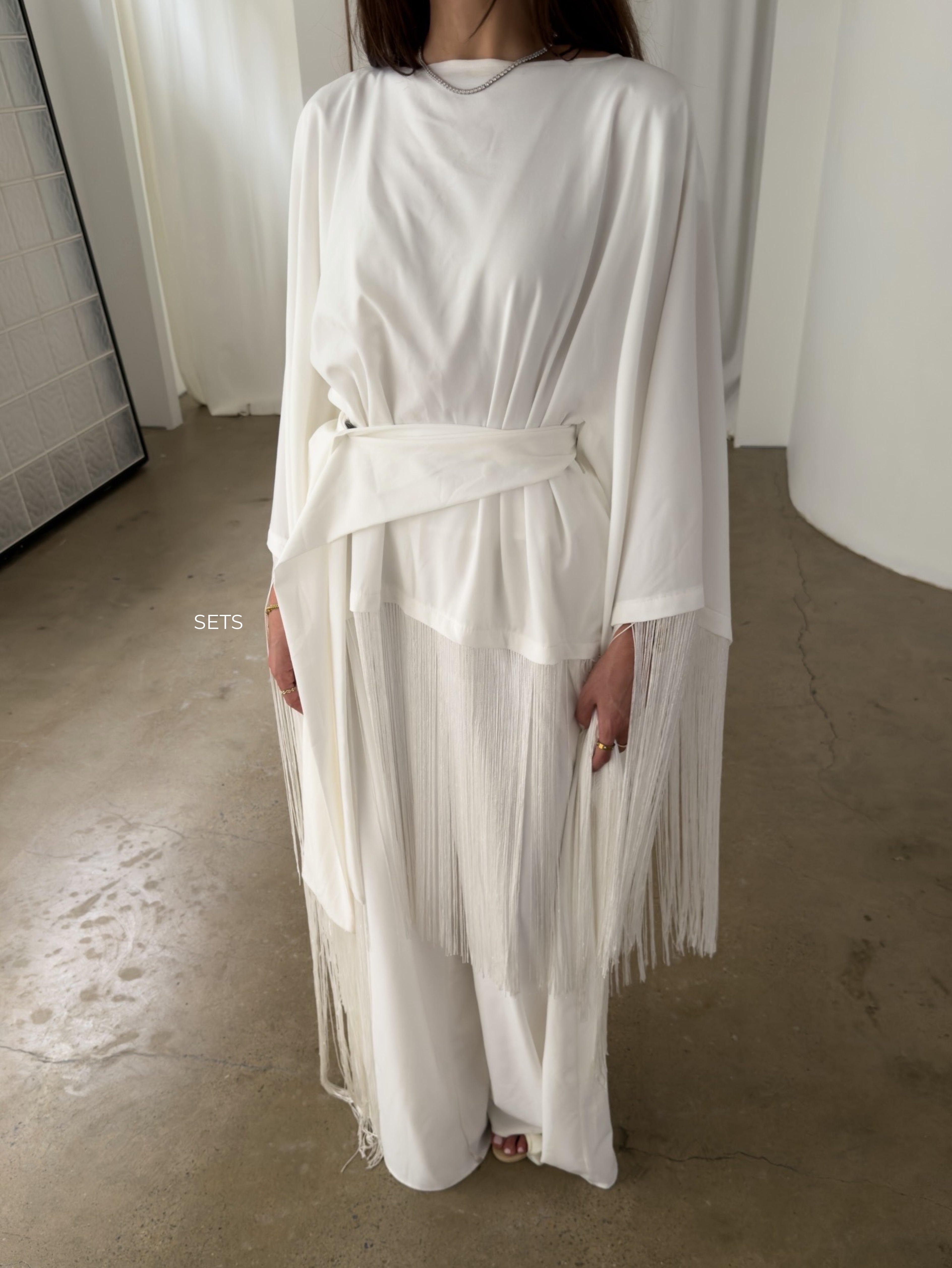 An asymmetrical butterfly silhouette with a hidden tie, paired with a fluid wide-leg pant. Fully jersey lined for coverage, designed to move lightly while holding its shape.