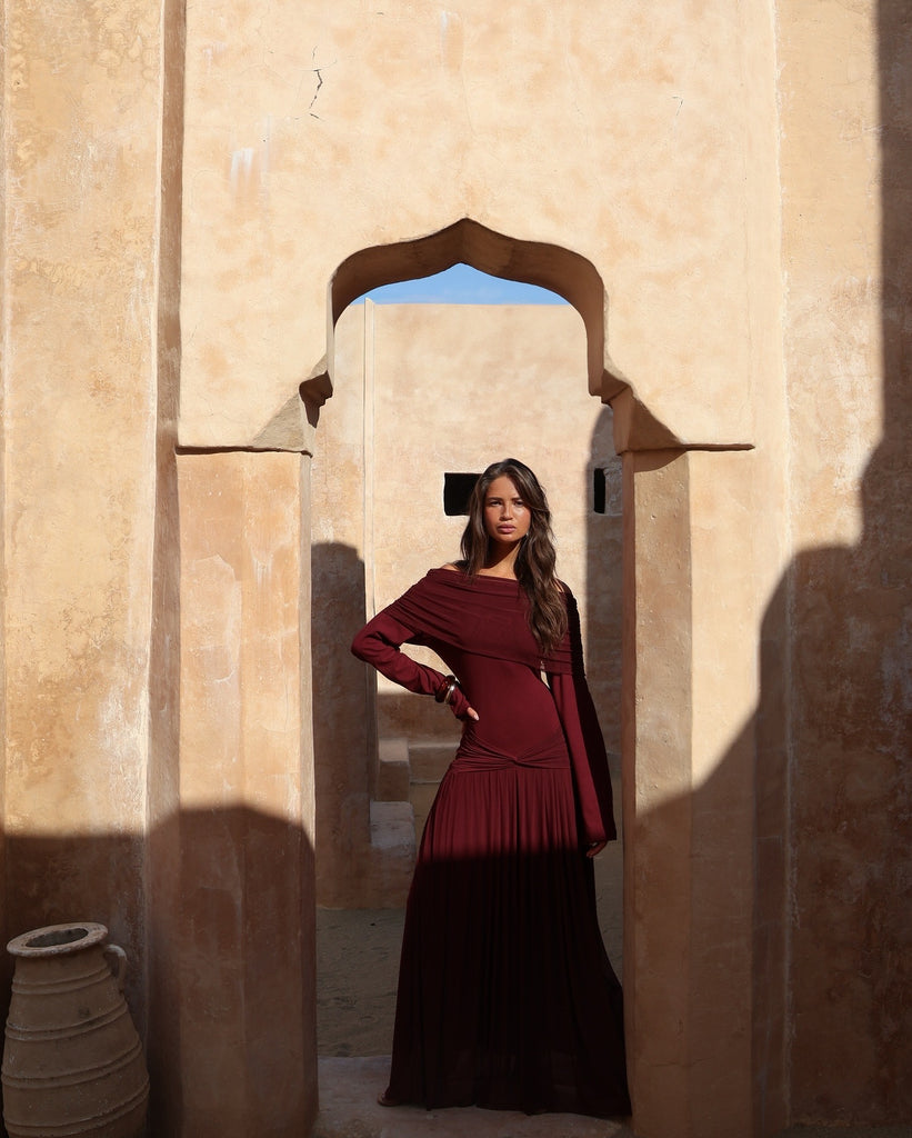 A statement in silhouette and tone, the Bella Bordeaux Maxi Dress evokes subtle drama with elegant restraint. Designed with a figure-enhancing waist crossover detail and a fluid mesh-jersey skirt overlay, it cascades with every step—balancing softness with structure.