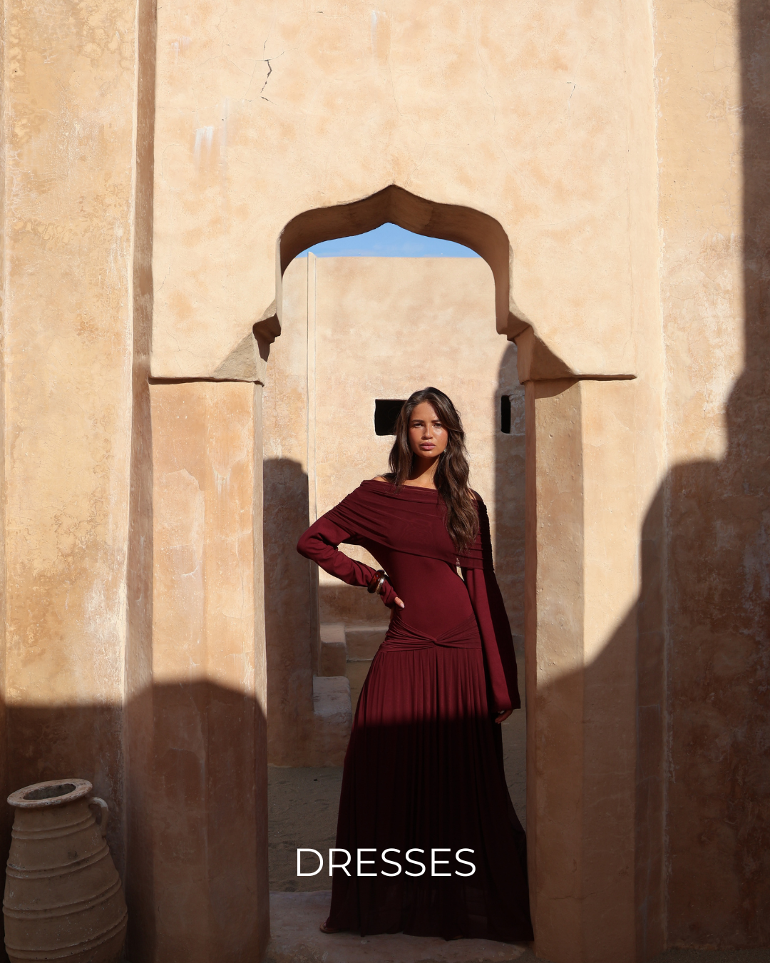 A statement in silhouette and tone, the Bella Bordeaux Maxi Dress evokes subtle drama with elegant restraint. Designed with a figure-enhancing waist crossover detail and a fluid mesh-jersey skirt overlay, it cascades with every step—balancing softness with structure.