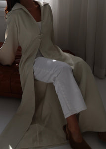 The Nia Abaya is an ode to quiet refinement. Crafted from lightweight crepe chiffon and fully lined for fluid coverage, it falls effortlessly while maintaining a soft, architectural structure. A pleated waist silhouette draws subtle definition through the centre, offering a tailored feel without compromising flow. The voluminous balloon sleeves add sculptural elegance, balanced by a row of fabric-covered buttons that trace the front for versatile styling. Rendered in a deep, uninterrupted black, Nia is a study in balance — poised yet relaxed, timeless yet modern.