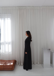 The Nia Abaya is an ode to quiet refinement. Crafted from lightweight crepe chiffon and fully lined for fluid coverage, it falls effortlessly while maintaining a soft, architectural structure. A pleated waist silhouette draws subtle definition through the centre, offering a tailored feel without compromising flow. The voluminous balloon sleeves add sculptural elegance, balanced by a row of fabric-covered buttons that trace the front for versatile styling. Rendered in a deep, uninterrupted black, Nia is a study in balance — poised yet relaxed, timeless yet modern.