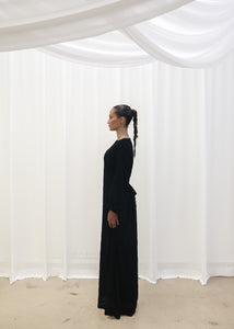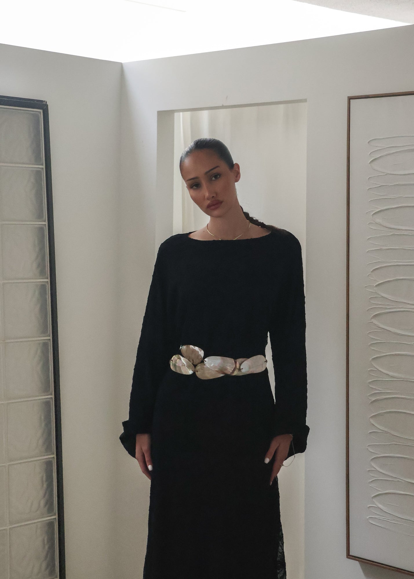 A discreet string tie at the back allows for an adjustable cinch at the waist, creating subtle shape while maintaining fluidity through the skirt. Timeless and considered, Celene is intended for elevated occasions and effortless evening wear.