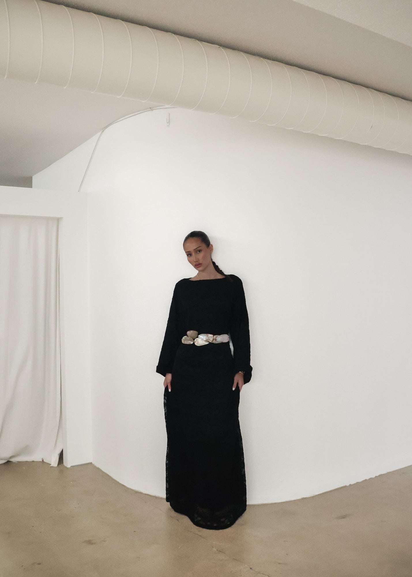 The Celene Lace Maxi Dress is a refined, full-length silhouette crafted from delicate lace and fully lined for coverage. Designed with a clean boat neckline and wide, folded sleeves, it balances soft structure with understated elegance.