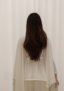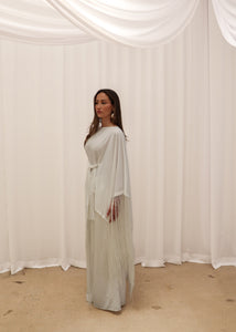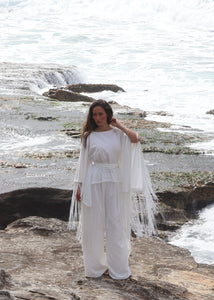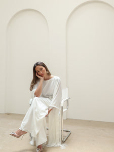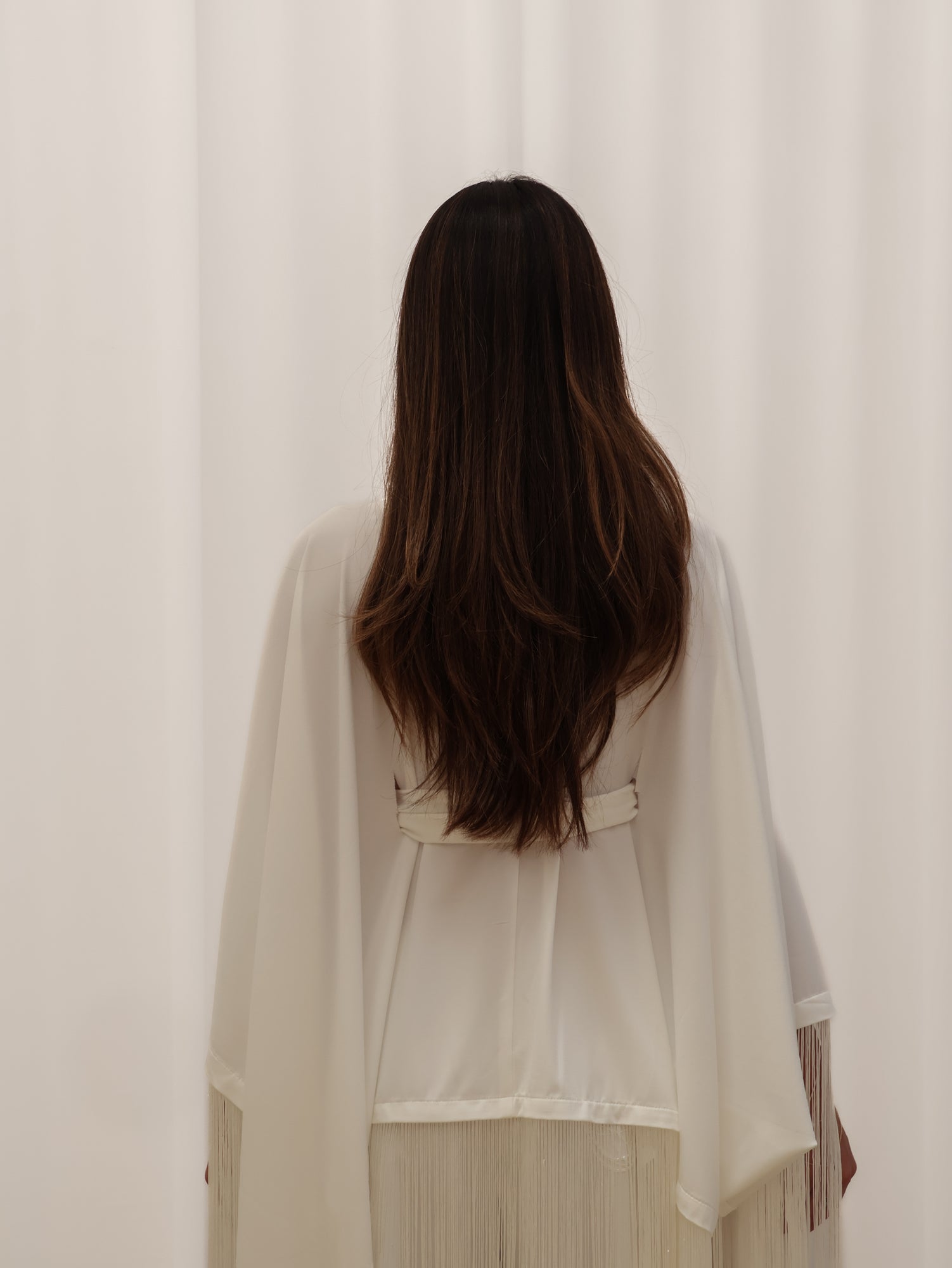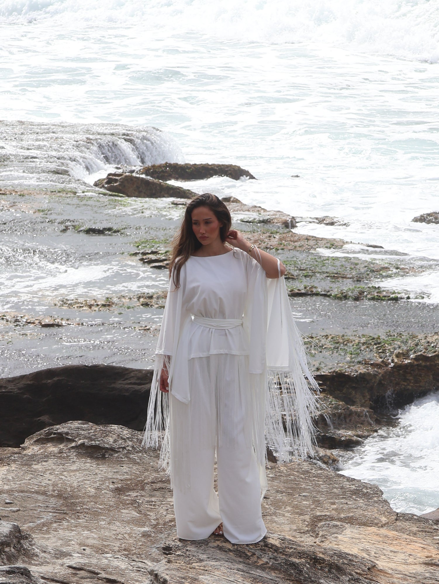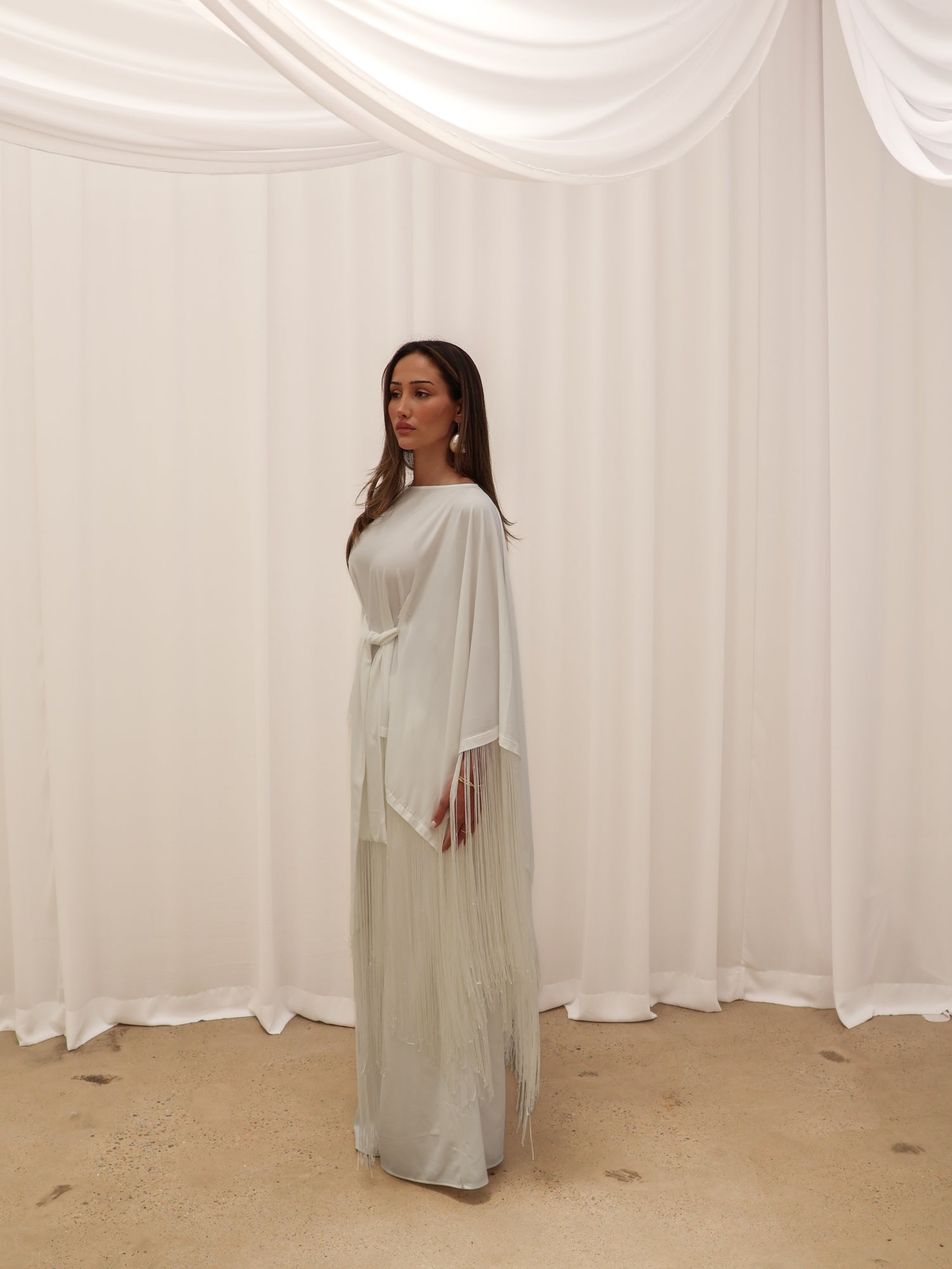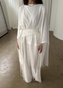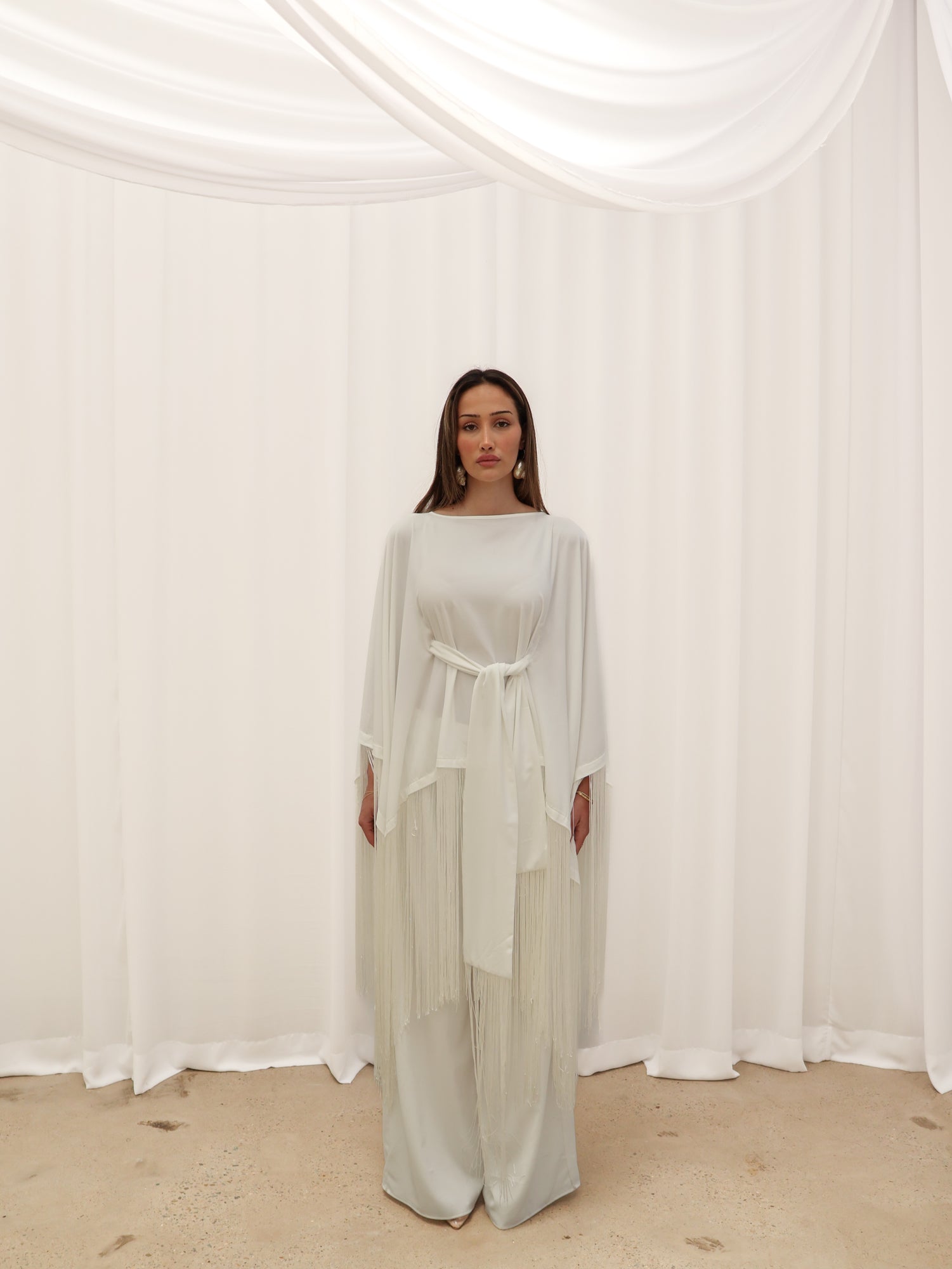 Paired with wide-leg pants designed with an elasticated waistband, the set offers ease without compromising refinement. A detachable and adjustable belt, finished with matching tassel appliqué, allows for custom cinching and versatile styling. Rhea is designed for elevated occasions, where detail and drape take focus.